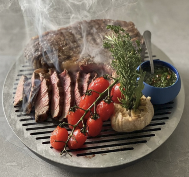 Решетку гриля можно подогреть в духовке, чтобы предотвратить термический шок при подаче мяса. Она имеет матовую отделку, что позволяет сохранить внешний вид изделия в условиях пламени и высокой температуры.